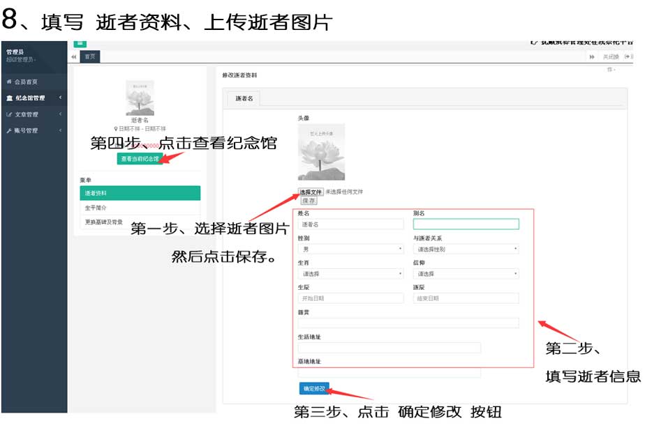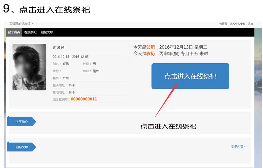 1.祭祀大廳管理 2.祭祀商品管理 3.紀(jì)念堂管理 4.墓園管理 5.會員管理 6.統(tǒng)籌管理 等...